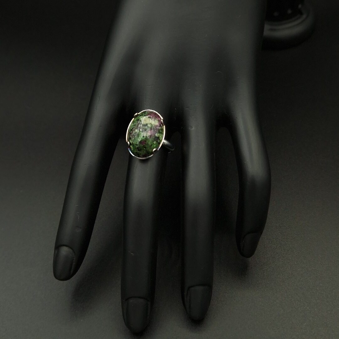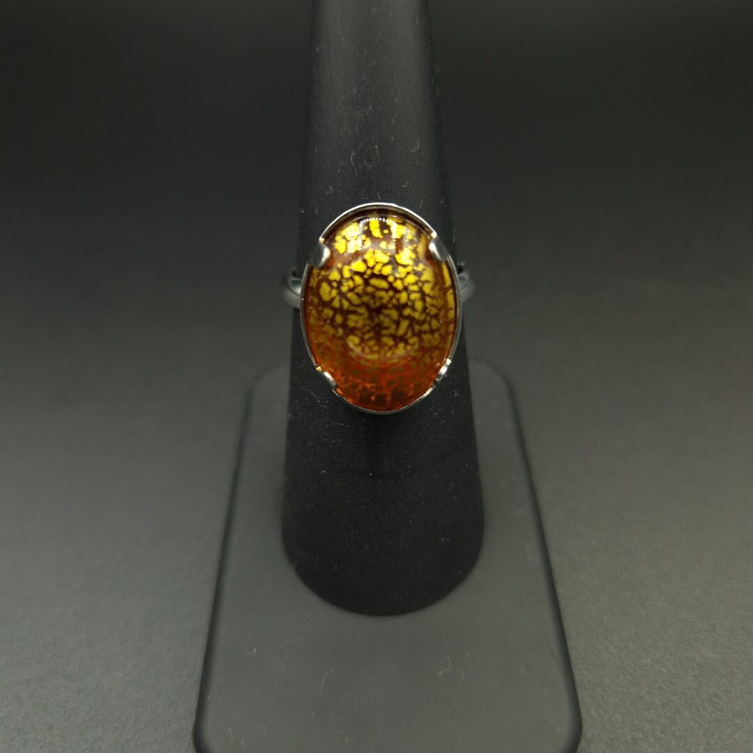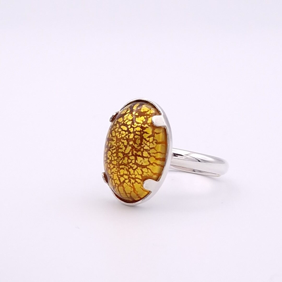 Bague réglable en métal argenté avec cabochon artisanal en verre ovale couleur ambre feuille d’argent de 13*18mm.