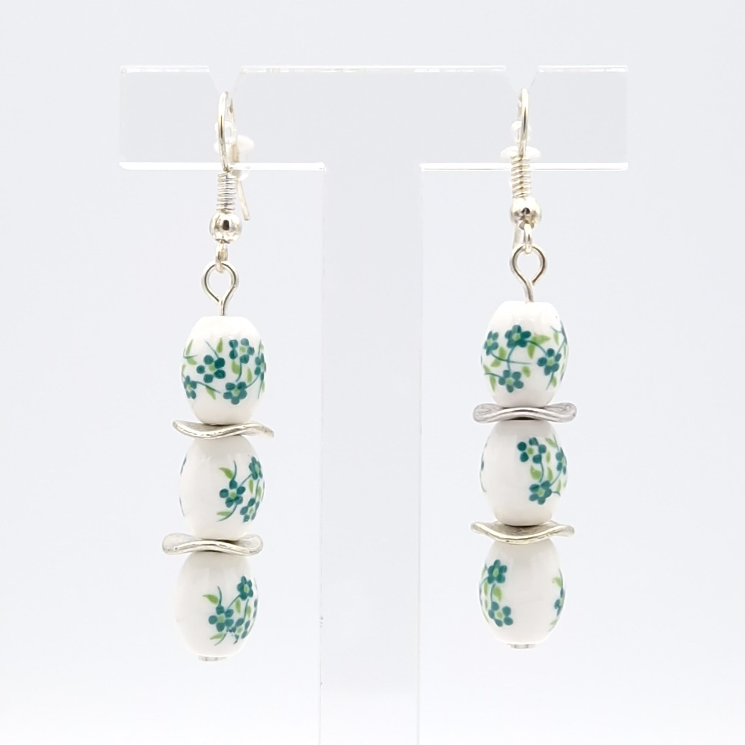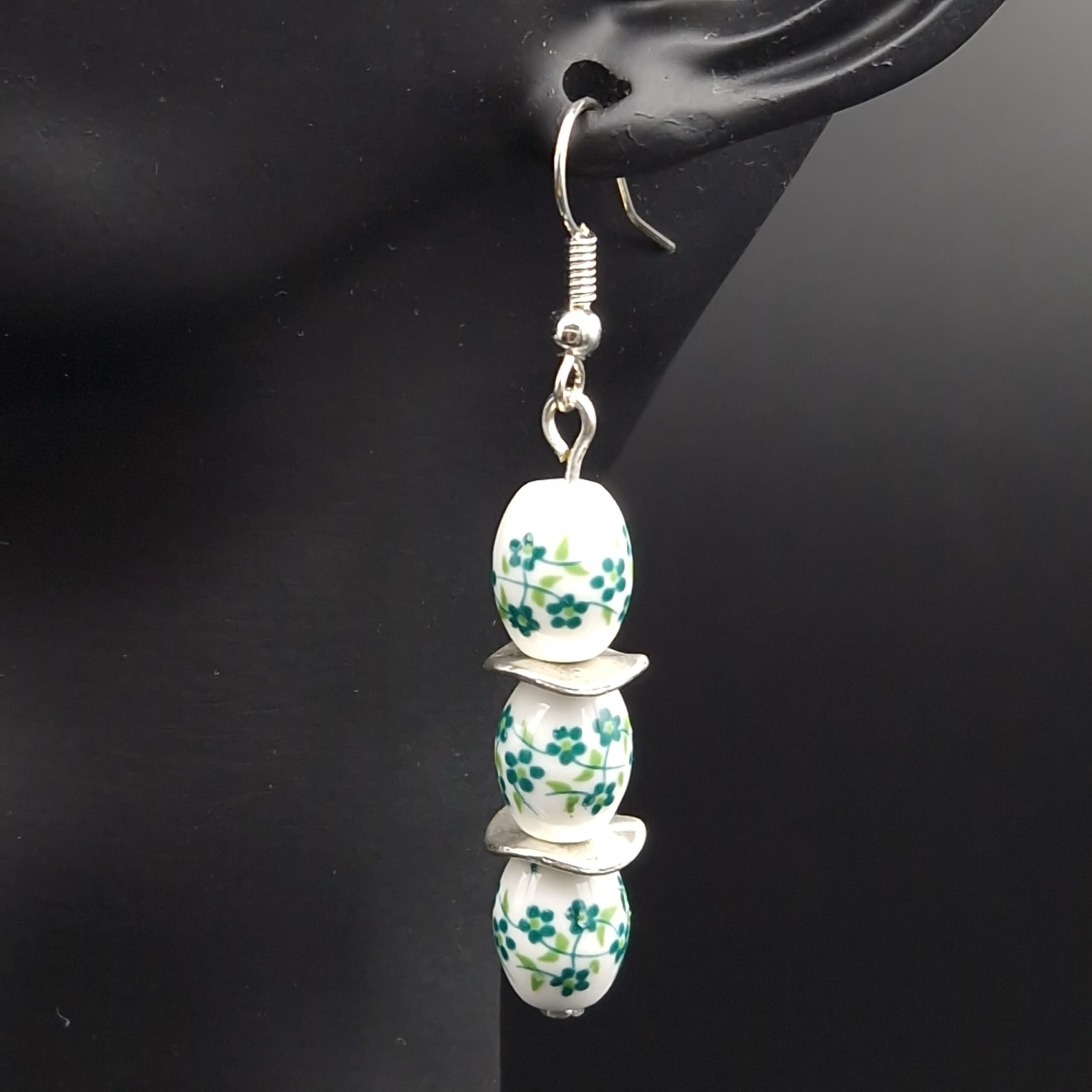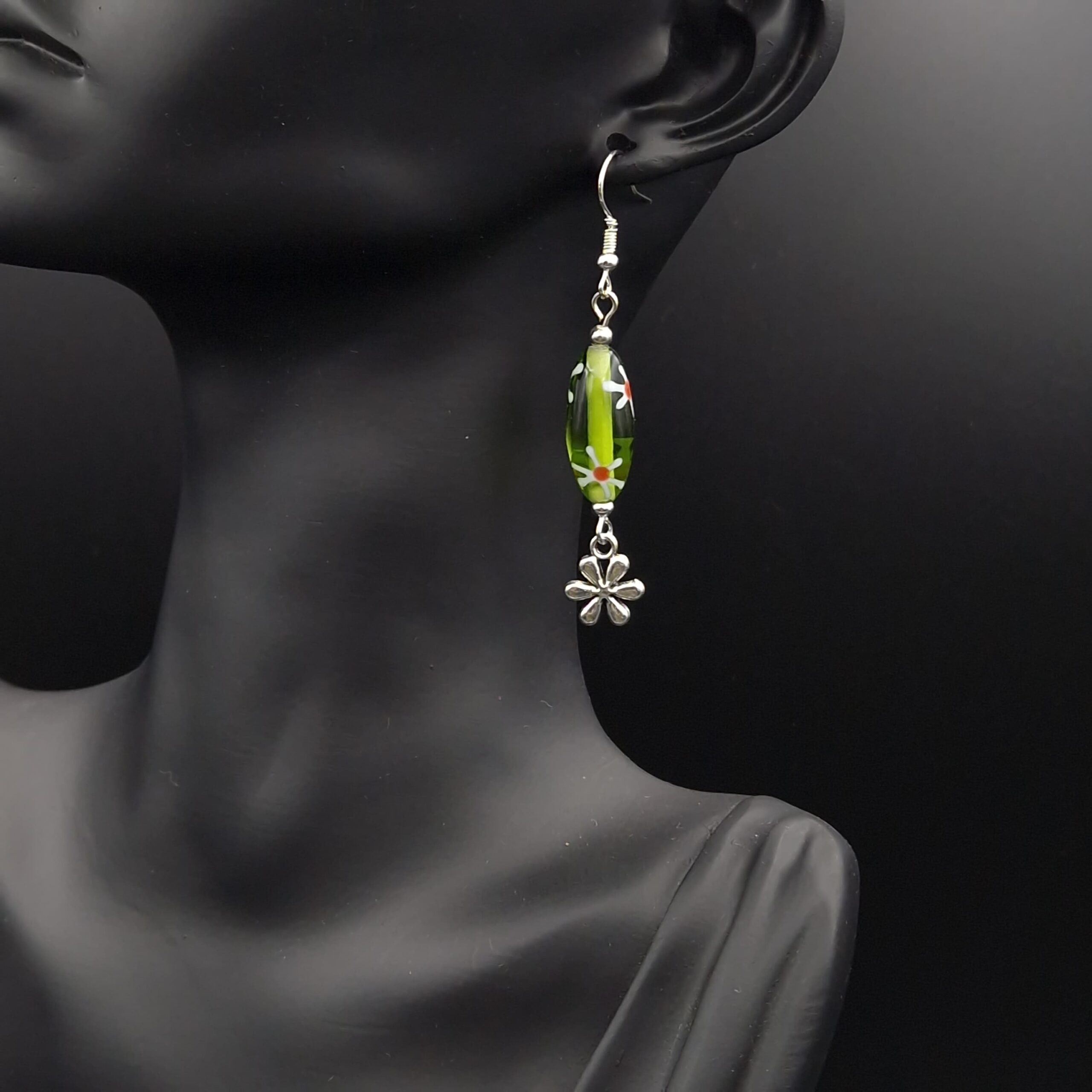 Boucles d’oreilles perles olives fleurs vertes sur fonds blanc, petites rondelles en métal argenté vieilli. Les crochets d’oreilles sont en métal argenté.