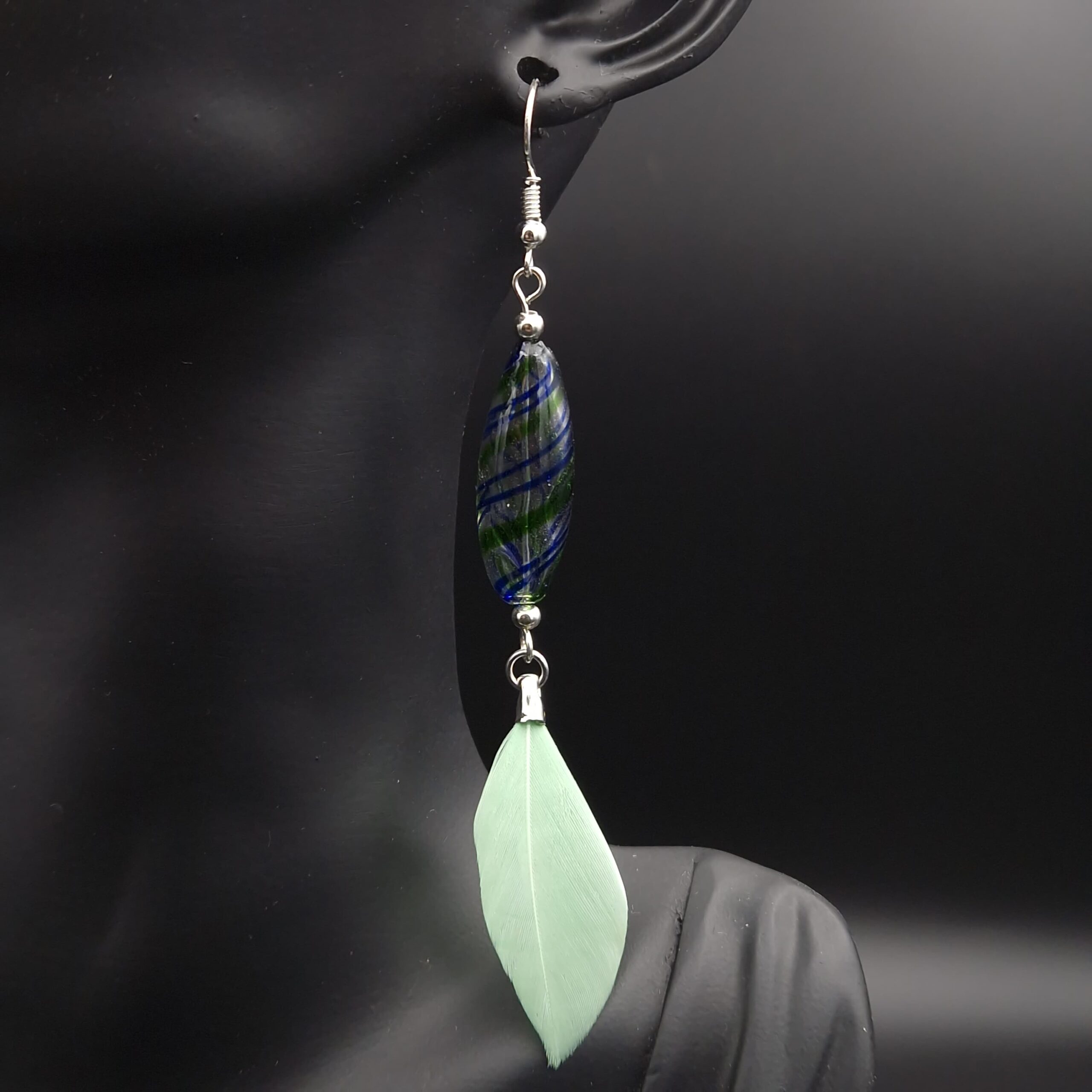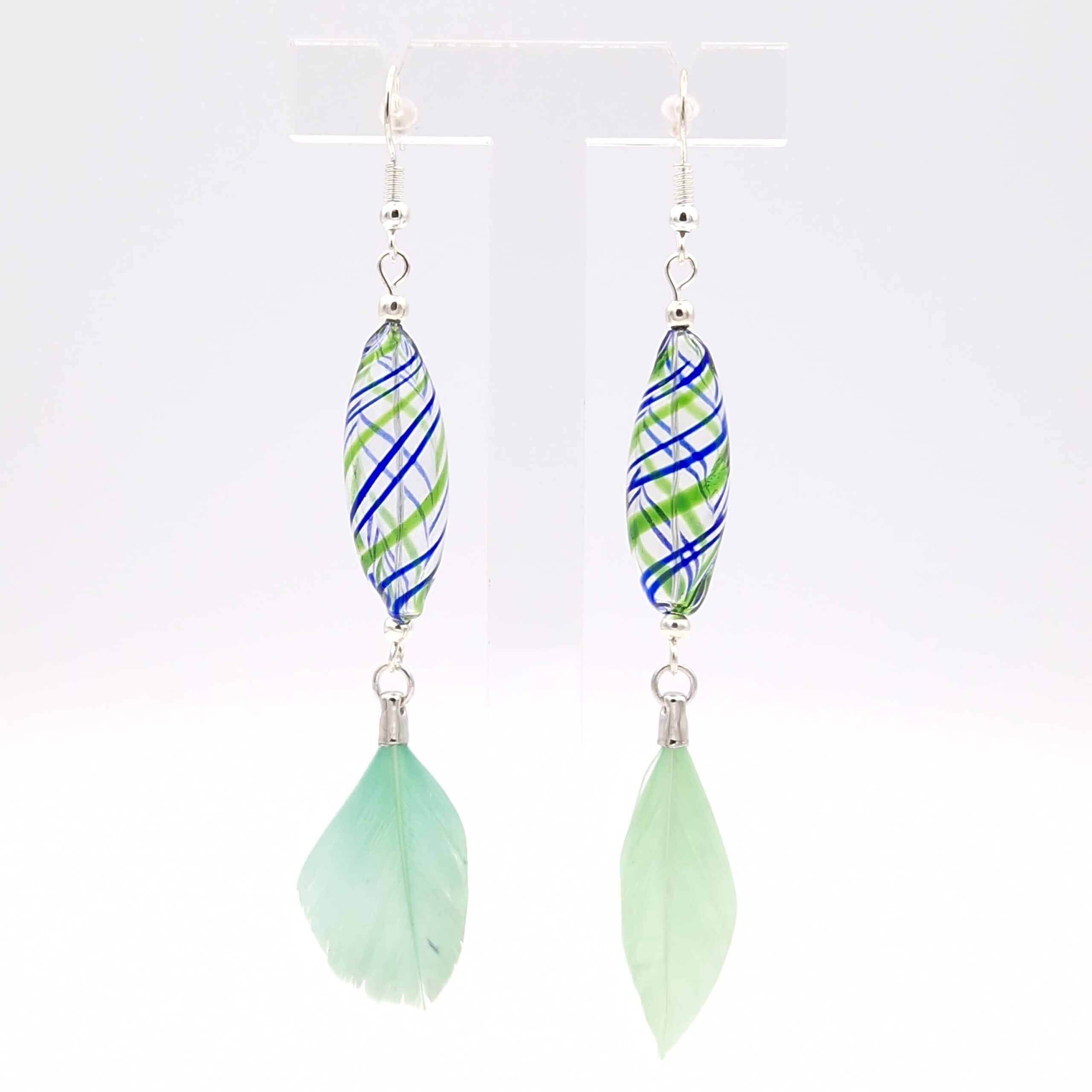Boucles d’oreilles avec perles olive en verre soufflé, translucides décor bleu et vert, plumes vert menthe. Les crochets d’oreilles sont en métal argenté.