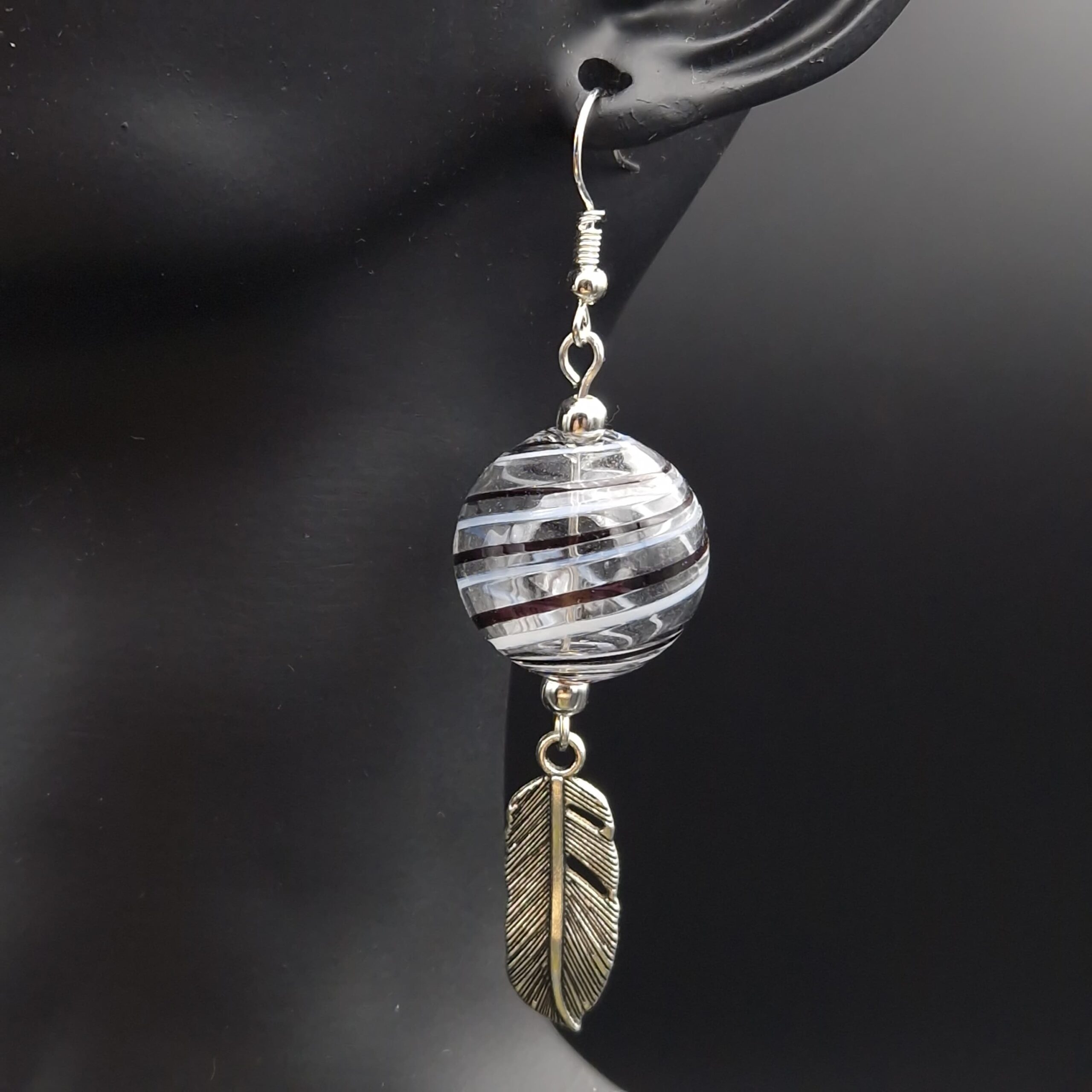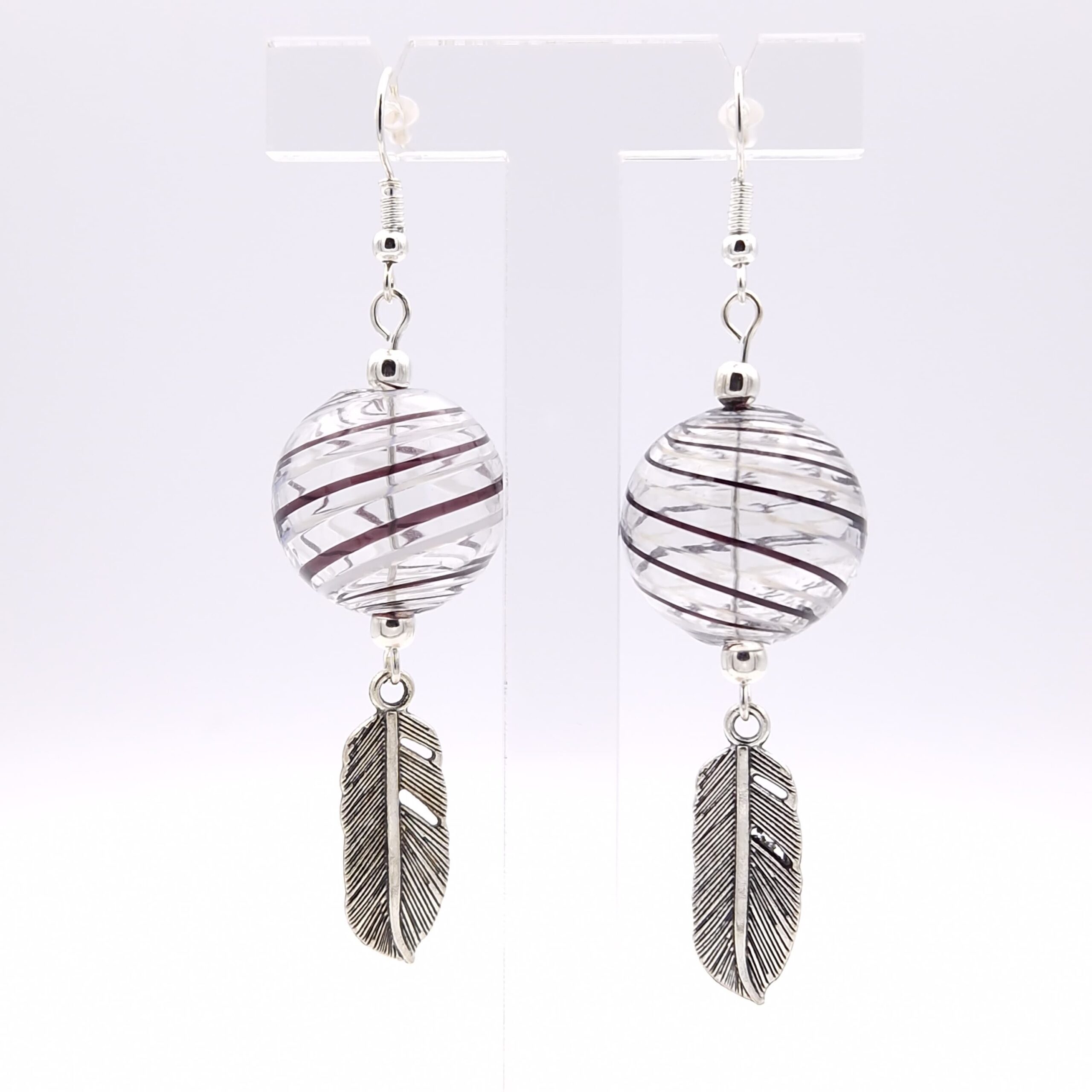 Boucles d’oreilles avec perles en verre soufflé de 2 cm, striées violet, noir et blanc, et plumes en métal argenté. Les crochets d’oreilles sont métal argenté.