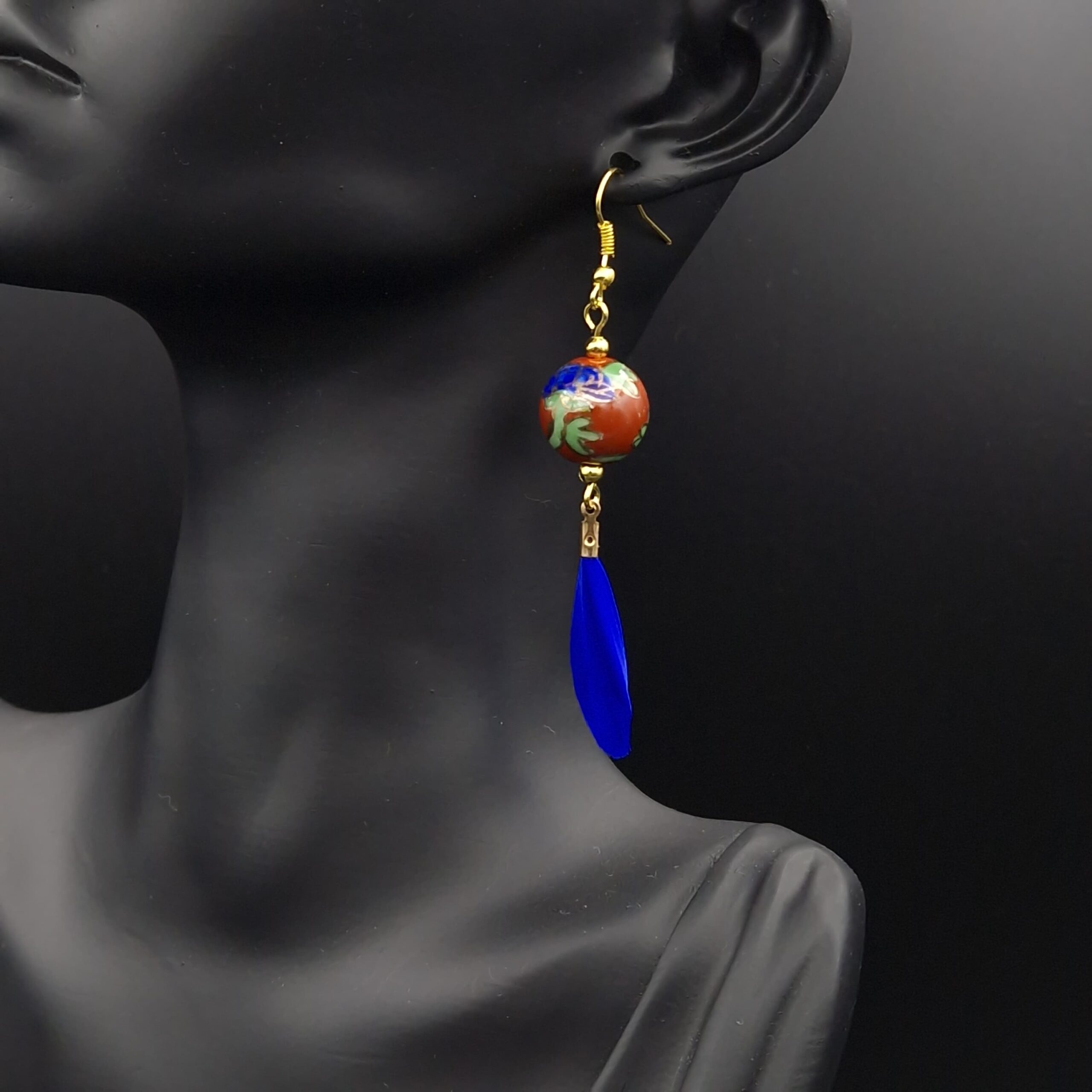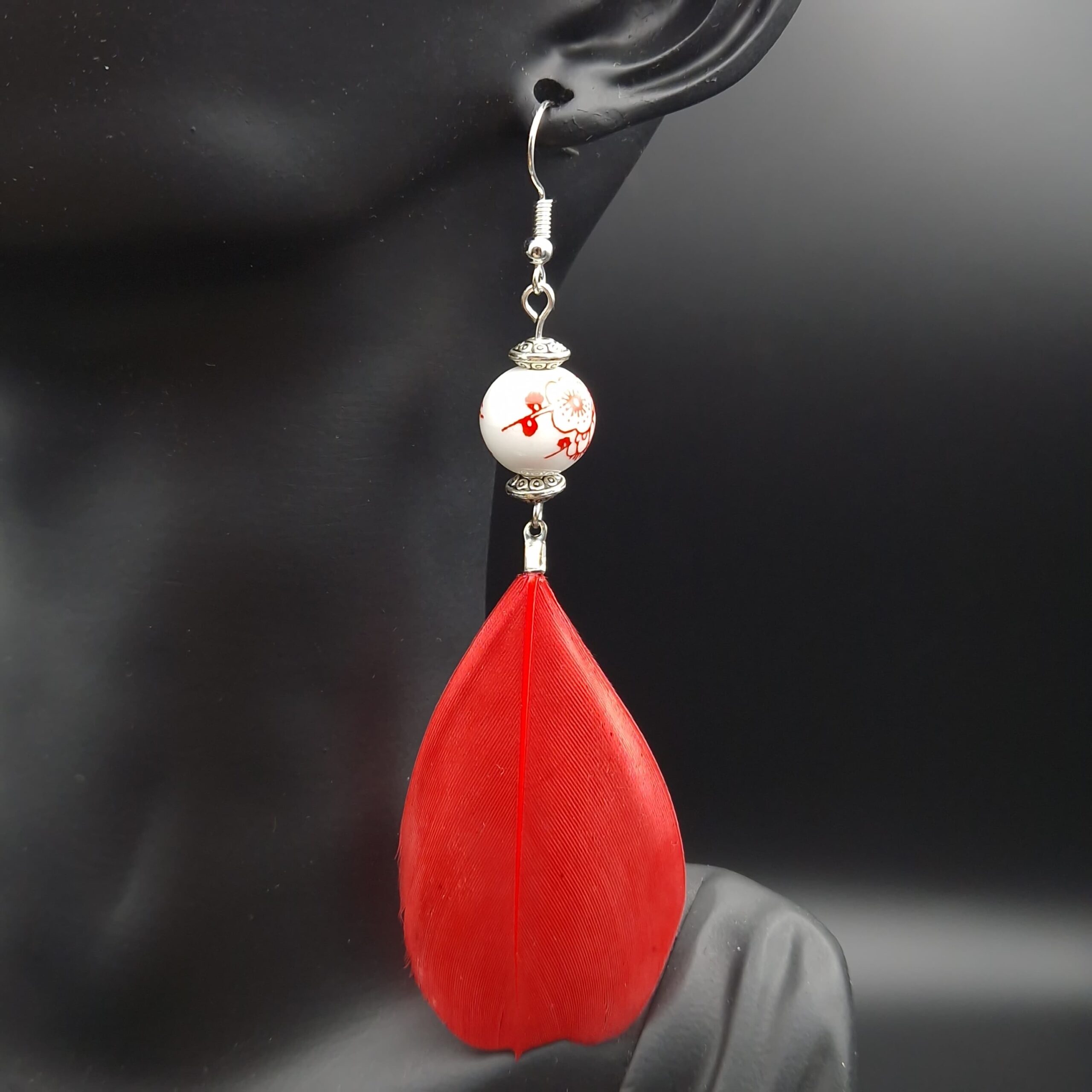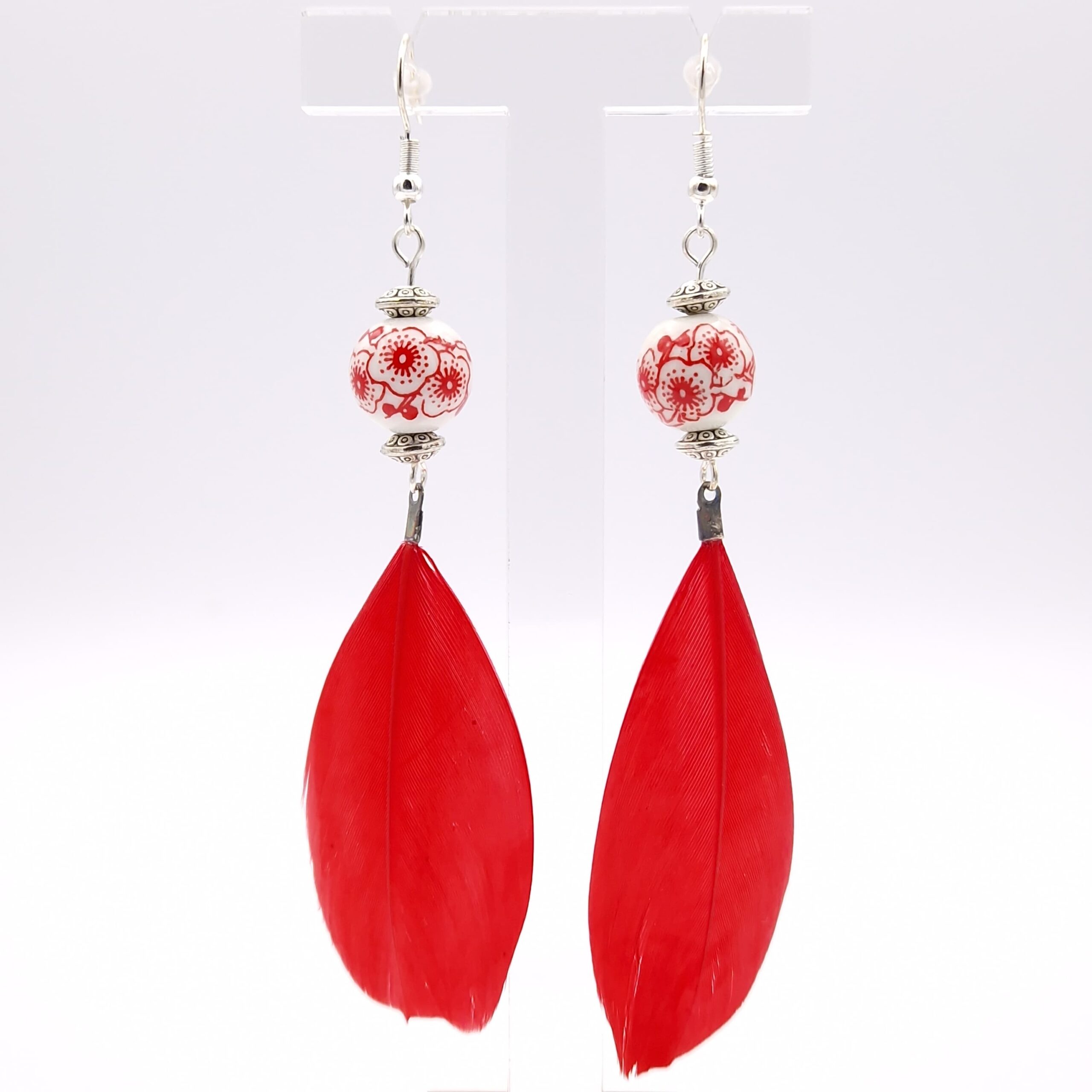 Boucles d’oreilles avec perles en céramique fleurs rouges sur fonds blanc de 1,2 cm et plumes rouges. Les crochets d’oreilles sont en métal argenté.