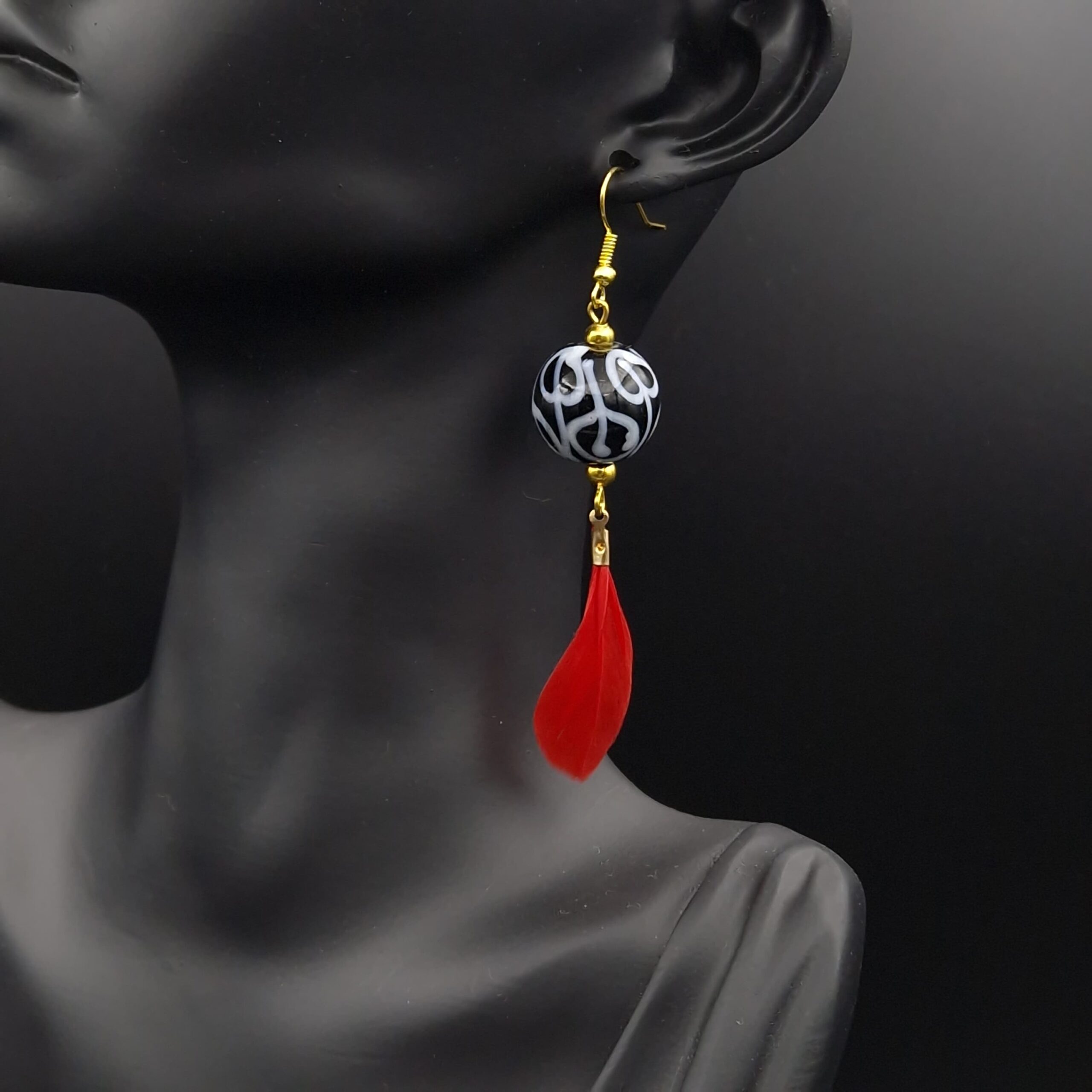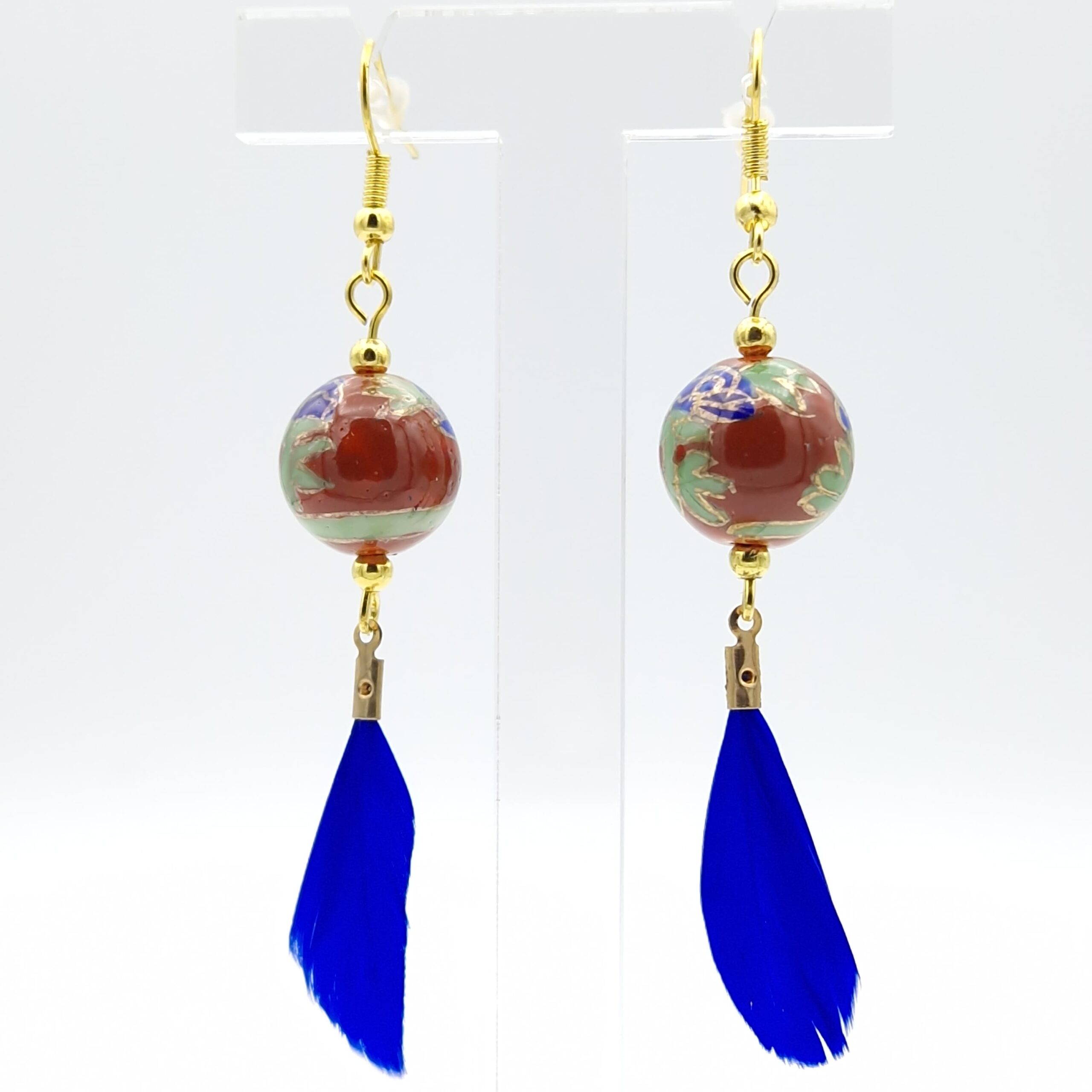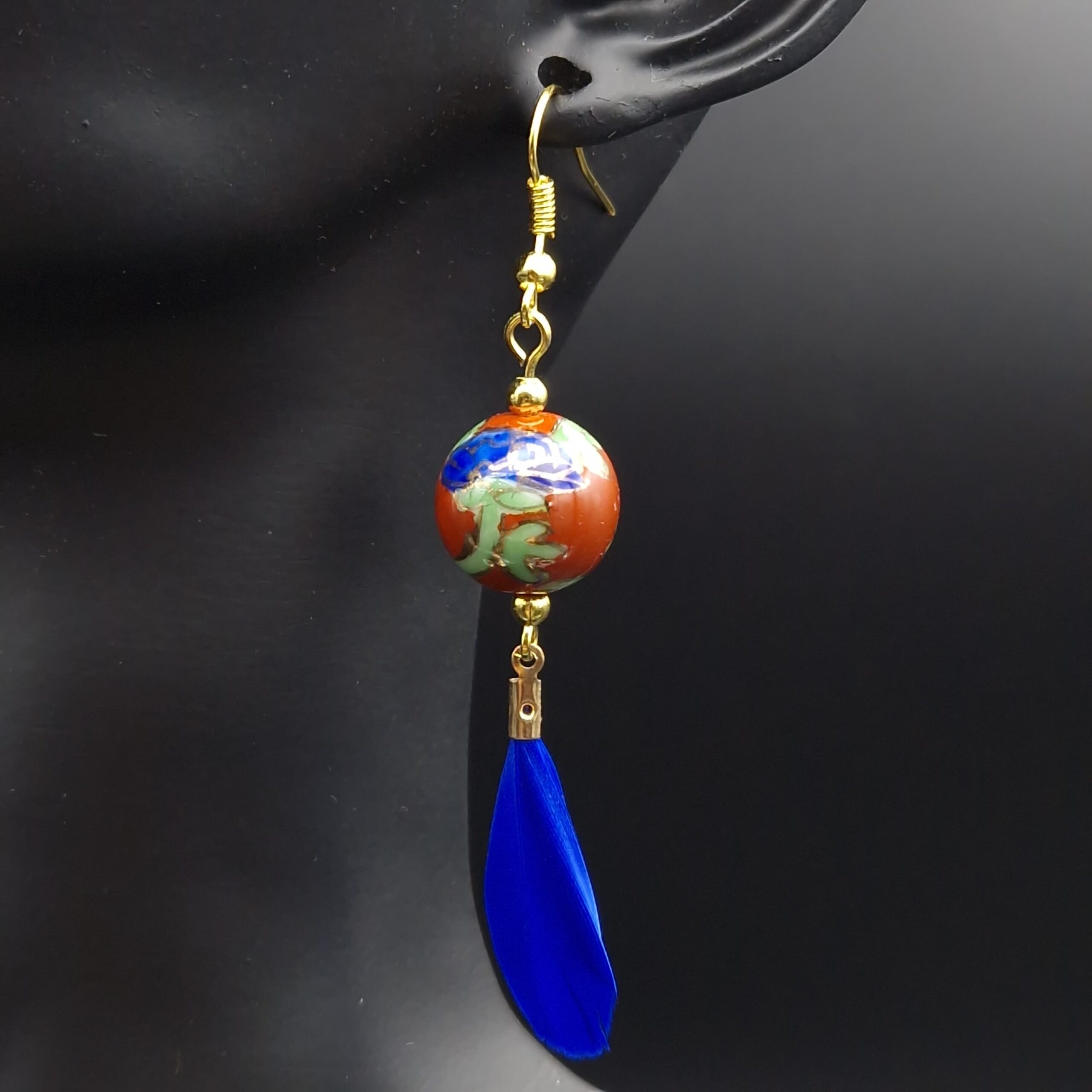 Boucles d’oreilles avec perles en céramique rouge/bleu/vert de 1,4 cm et plumes bleu roi. Les crochets d’oreilles sont métal doré.